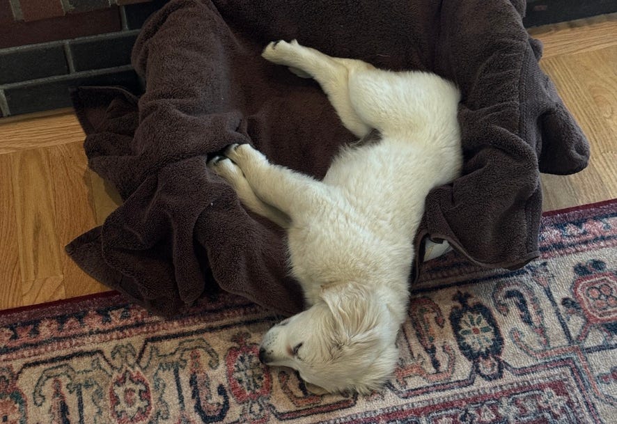 I’ll leave you with this pic of Cooper, Emily’s folks’ new puppy, who is still learning how to sleep in his bed properly. We trust he’ll get there eventually.