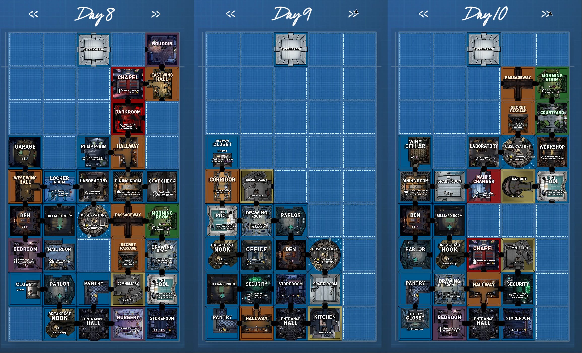 No matter how well you may do on a given day, your character will eventually run out of energy or find himself otherwise unable to progress. At that point the day ends, and a new one begins with a fresh grid, and 45 new possibilities for mystery and learning. That seemingly simple idea—a mercurial mansion that resets itself each time the player goes to sleep—is the key to the game’s repetitive, nonlinear flow, and to the stickiness that makes it so engrossing and satisfying.